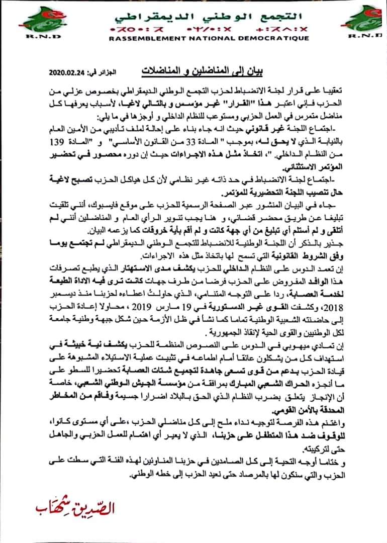 وأوضح ذات البيان أنّ إجتماع لجنة الإنضباط غير قانوني كون الملف التأديبي قُدّم من طرف رئيس الحزب بالنيابة، هو الأمر غير المخول له حسب قنون الحزب الداخلي، بهذا، المتحدث ذاته، يعتبر القرار غير قانوني.