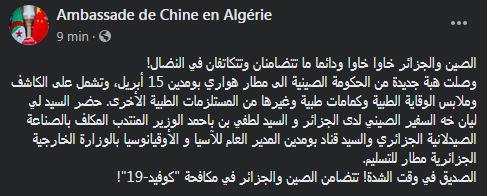 وأضافت السفارة الصينية “الصديق في وقت الشدة! تتضامن الصين والجزائر في مكافحة “كوفيد-19”.