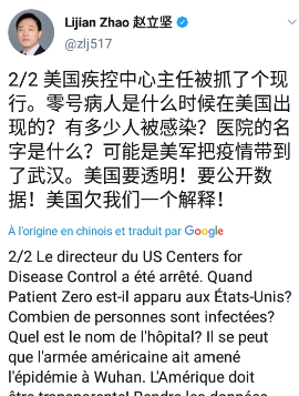 كما قال المتحدث بإسم وزارة الخارجية الصينية، تشاو لي جيان، في تغريدة، “إنّ الجيش الأميركي ربما جلب فيروس كورونا إلى مدينة ووهان الصينية، التي كانت الأكثر تضرراً بالفيروس”.