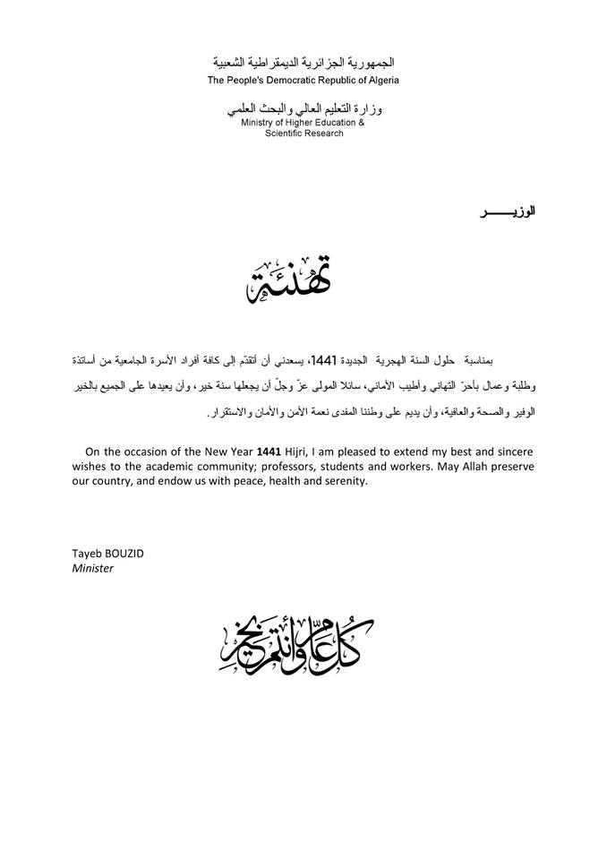 الطيب بوزيد يهنئ الأسرة الجامعية بالسنة الهجرية الجديدة بالإنجليزية