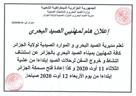 وأضافت المديرية أنه سيتم أيضا إعادة فتح مسمكة الجزائر إبتداء من يوم الأربعاء 12 أوت 2020 صباحا.