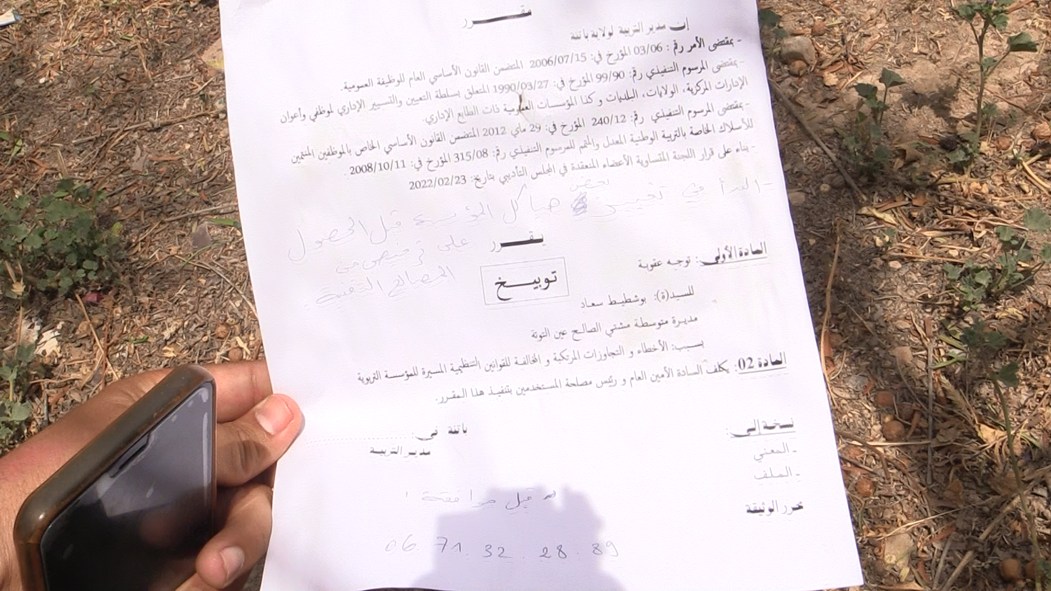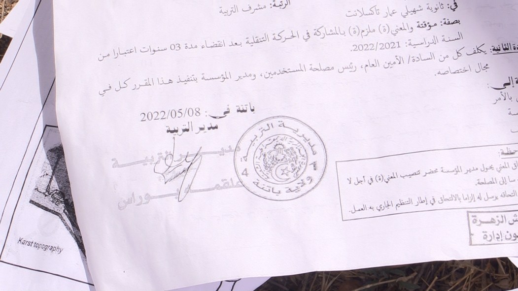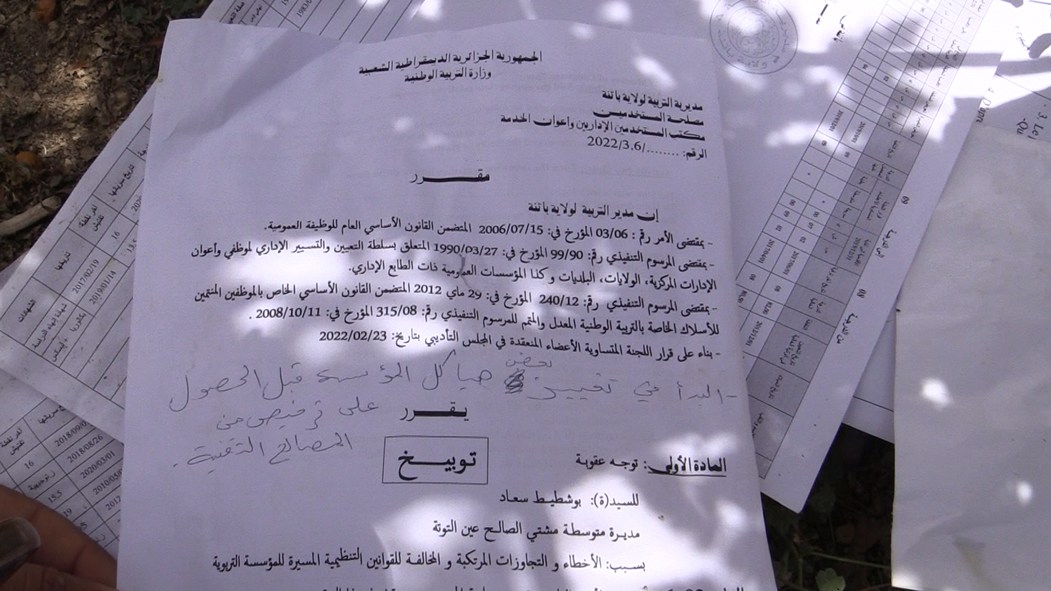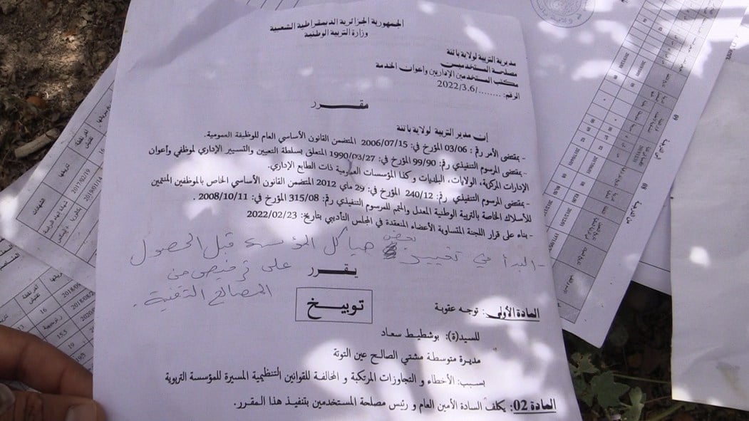 وحسب المعاينة الميدانية التي قامت بها “النهار”، فإن هذه الوثائق متنوعة تحمل جميع المعلومات الخاصة بأصحابها الموظفين من تواريخ الميلاد والرتب الوظيفية وأرقام الحسابات الجارية والوضعيات الإدارية، منها ما تتعلق بالخصم والإنذار والتوبيخ وتوقيف الراتب لبعض المديرين والأساتذة والموظفين الذين ارتكبوا أخطاءً أثناء ممارسة مهامهم، ووثائق أخرى تخص الترقية والتحويل والتنصيب، بعضها منسوخة وأخرى أصلية عليها ختم وتوقيع مدير التربية الحالي، على غرار مقرر يحمل رقم 1258 / 3.6 /2022 الخاص بتعيين “ت.ع” كمشرف تربية في ثانوية “شهيلي عمار” في “تاكسلانت” المؤرخ في 8 ماي 2022، إضافة إلى وثائق تحمل ختم وتوقيع مديري تربية سابقين كلها صادرة عن مصلحة المستخدمين.