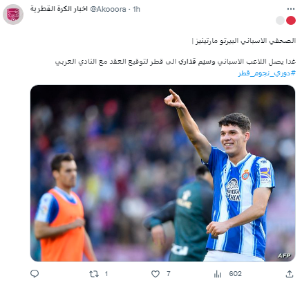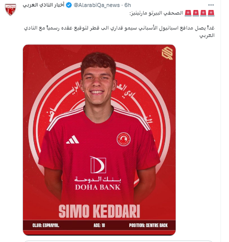 وأكد المصدر، أن قداري “يملك الجنسبة الإسبانية” سيوقع في نادي العربي القطري على عقد لـ 3 سنوات، رغم أنه يبلغ 18 سنة فقط. كما قال أن سيحل بالدوحة غدا.