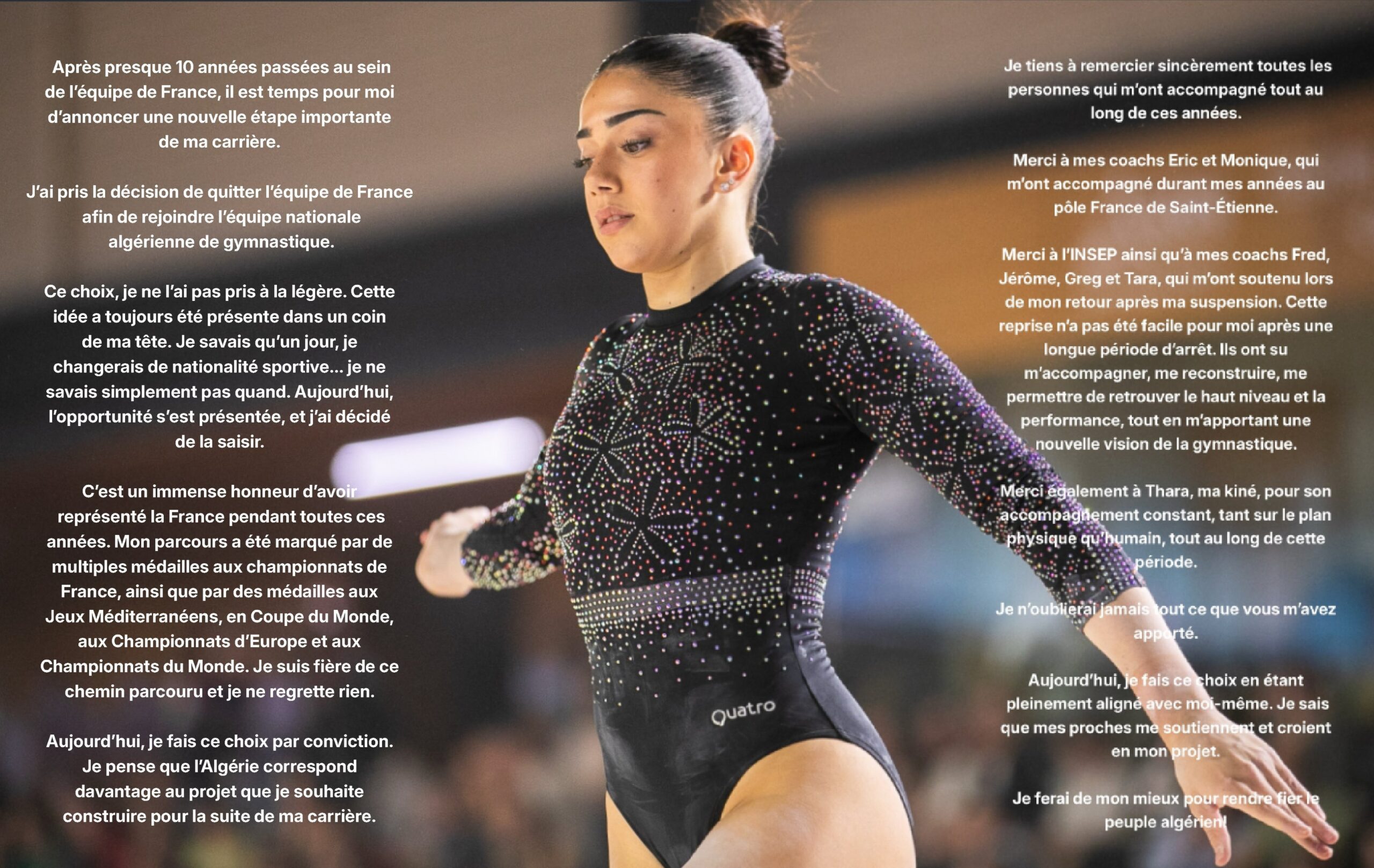 ونشرت جنى العروي، رسالة عبر حسابها على منصة “إكس”، أكدت فيها بأن قرارها بتغيير جنسيتها الرياضية، من أجل تمثيل الجزائر، كان عن قناعة تامة منها.