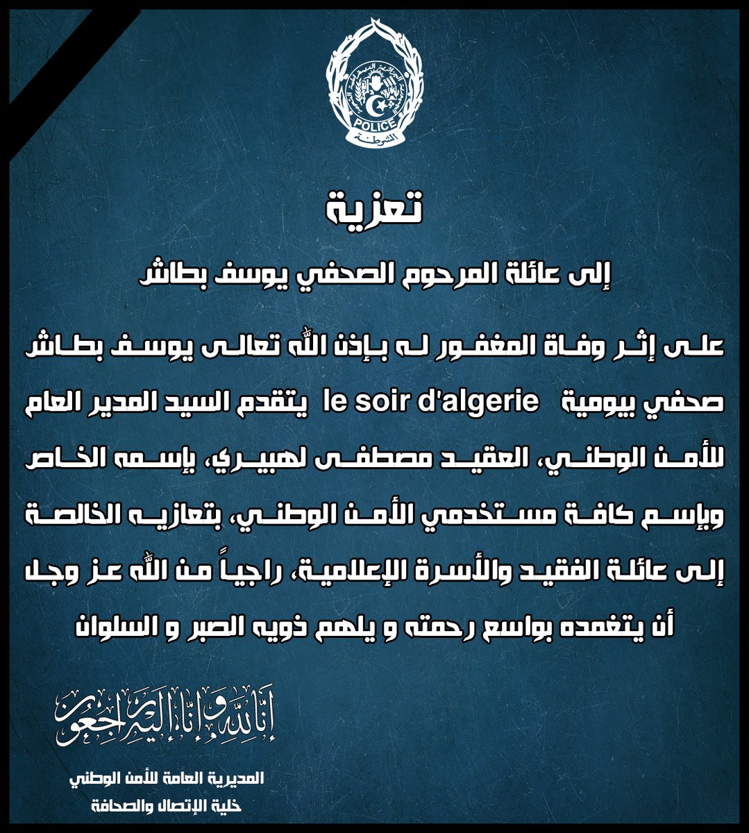 قدم المدير العام للأمن الوطني، العقيد “مصطفى لهبيري”، تعازيه لعائلة الإعلامي “يوسف بطاش”، على إثر وفاة الأخير صباح اليوم الجمعة.