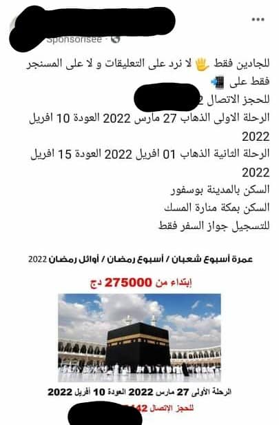 حذرت منظمة حماية المستهلك، في منشور لها، من الإعلانات المتداولة في صفحات مواقع التواصل الاجتماعي حول أسعار العمرة. كما وصفت المنظمة، هذه الإعلانات بـ”المزيفة”، و “غير مؤسسة”، لكون التراخيص لم يتم منحها بعد.