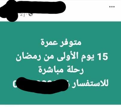 حذرت منظمة حماية المستهلك، في منشور لها، من الإعلانات المتداولة في صفحات مواقع التواصل الاجتماعي حول أسعار العمرة. كما وصفت المنظمة، هذه الإعلانات بـ”المزيفة”، و “غير مؤسسة”، لكون التراخيص لم يتم منحها بعد.