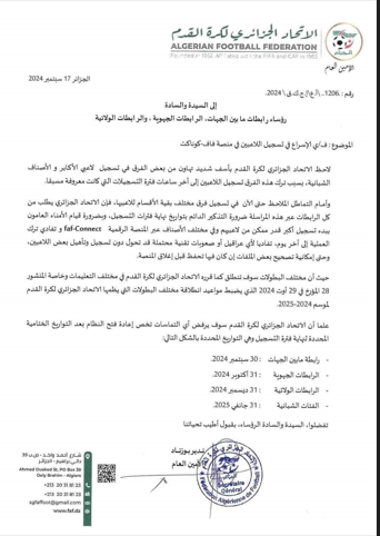 دعا الاتحاد الجزائري لكرة القدم كافة الأندية الرياضية عبر مختلف الأقسام إلى تسريع عملية تسجيل لاعبيها على منصة “فاف كونيكت” (faf-Connect).