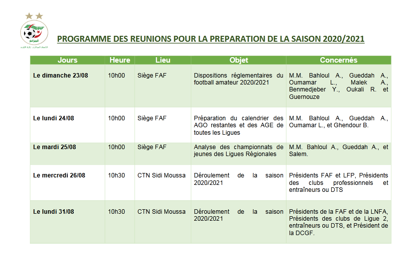 كشف الإتحادية الجزائري لكرة القدم “فاف”، عن برمجته لاجتماعات في الفترة ما بين 23 إلى 31 أوت الجاري، بغرض التحضير للموسم الكروي الجديد 2020-2021.