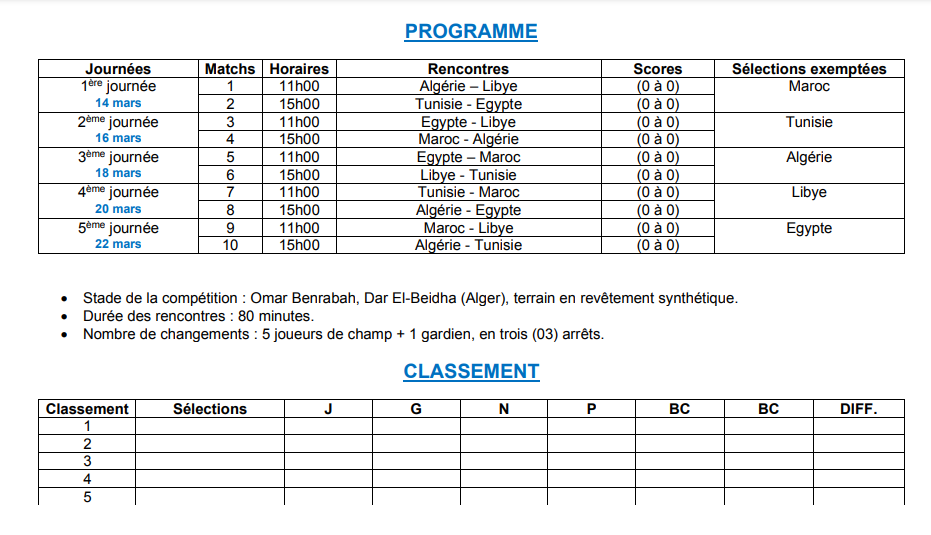 يذكر أن مباريات هذه البطولة والتي ستدوم إلى غاية 24 مارس الجاري، ستجرى، بملعب “عمر بن رابح” بالدار البيضاء.