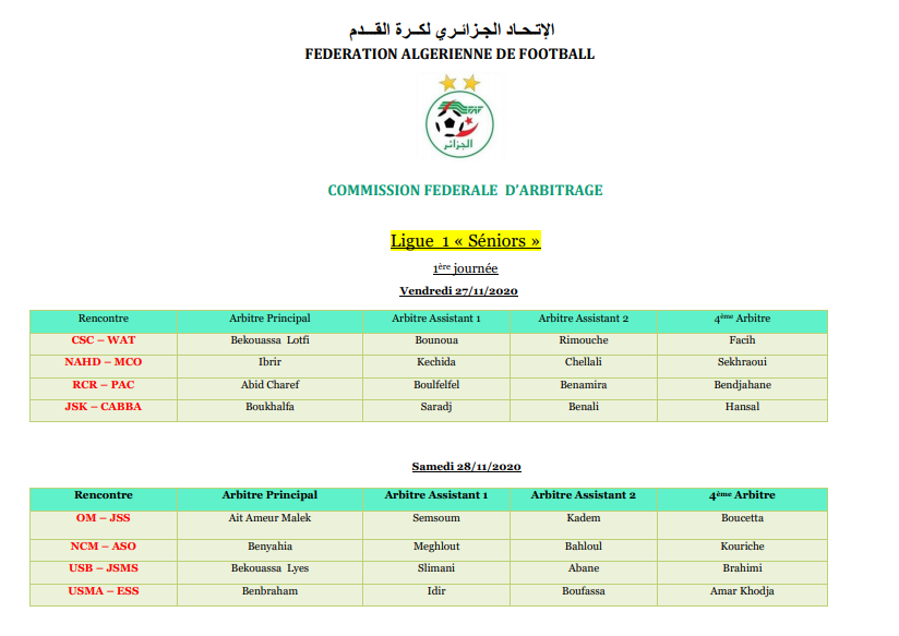 عينت اللجنة الفيدرالية للتحكيم، الحكام المعنيين بإدارة مباريات الجولة الأولى من المحترف الأول، المقرر انطلاقها يوم الجمعة المقبل.