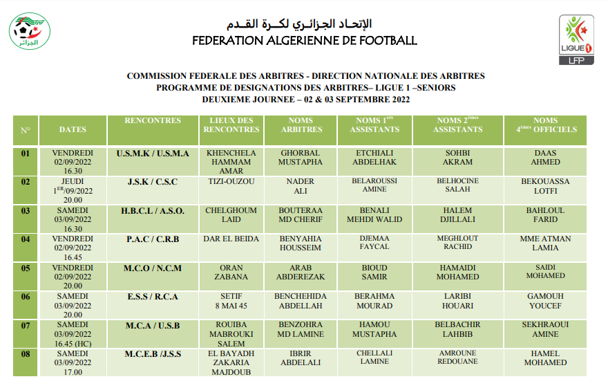 كما تم تكليف الحكم بن يحي، لغدارة القمة الثانية من هذه الجولة، بين نادي بارادو، وشباب بلوزداد، بمساعدة جماع، ومغلوط.