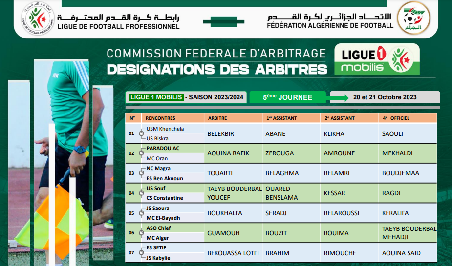 كشف الإتحاد الجزائري لكرة القدم “الفاف”، عن تعيينات الحكام، التي أقرّتها لجنة التحكيم، والخاصة بالجولة الخامسة من البطولة المحترفة.