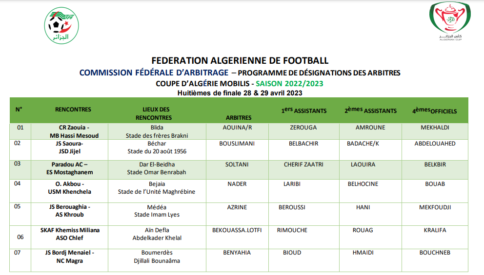الفاف تكشف تعيينات حكام مباريات ثمن نهائي كأس الجمهورية
