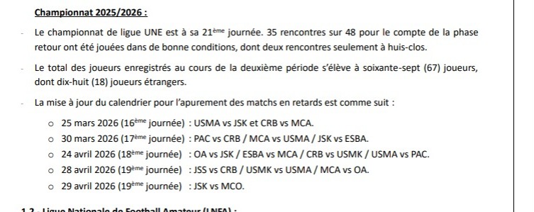 كشفت الاتحادية الجزائرية لكرة القدم “فاف”، عن تواريخ إجراء المباريات المتأخرة من البطولة المحترفة، للموسم الجاري 2025-2026، وذلك، على هامش اجتماعها الفدرالي الأخير.