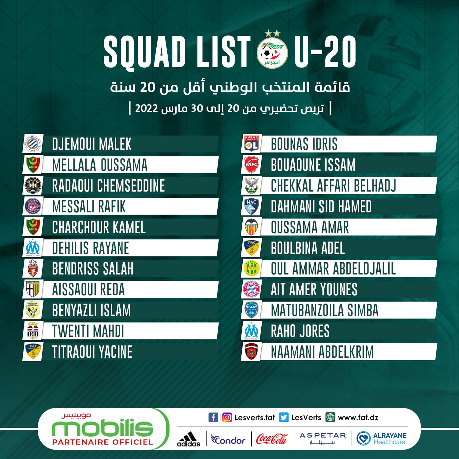 كشفت الإتحادية الجزائرية لكرة القدم الفاف عن قائمة اللاعبين المعنية بتربص المنتخب الوطني لأقل من 20 سنة من 20 إلى 30 مارس 2022