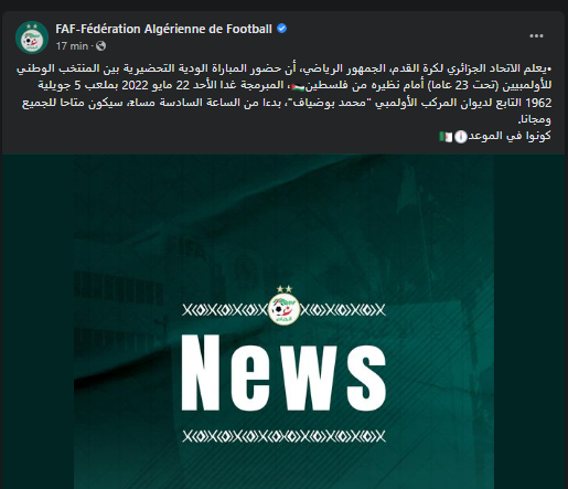 أعلنت اليوم السبت، الإتحادية الجزائرية لكرة القدم، عن موعد مباراة المنتخب الوطني الأولمبي، ضد المنتخب الفلسطيني.