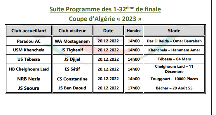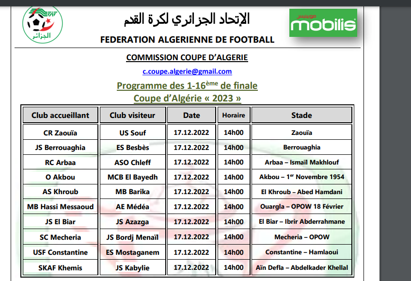 كشف الاتحاد الجزائري لكرة القدم، اليوم الخميس، البرنامج المعتمد من طرف لجنة تنظيم كأس الجمهورية، لمباريات الدور الـ16.