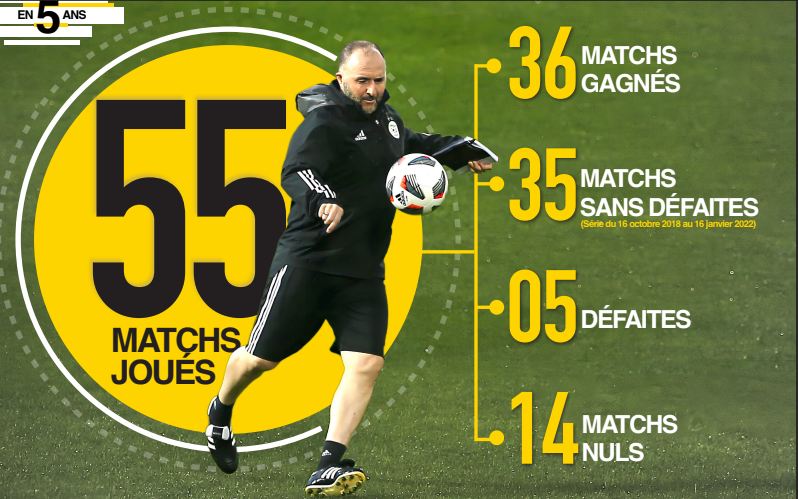 كما أظهرت الاحصائيات بأن بلماضي، قاد المنتخب في 55 مباراة فاز بـ 36 وانهزم في 5 فقط مقابل 14 تعادلا.