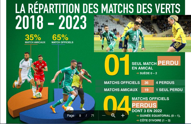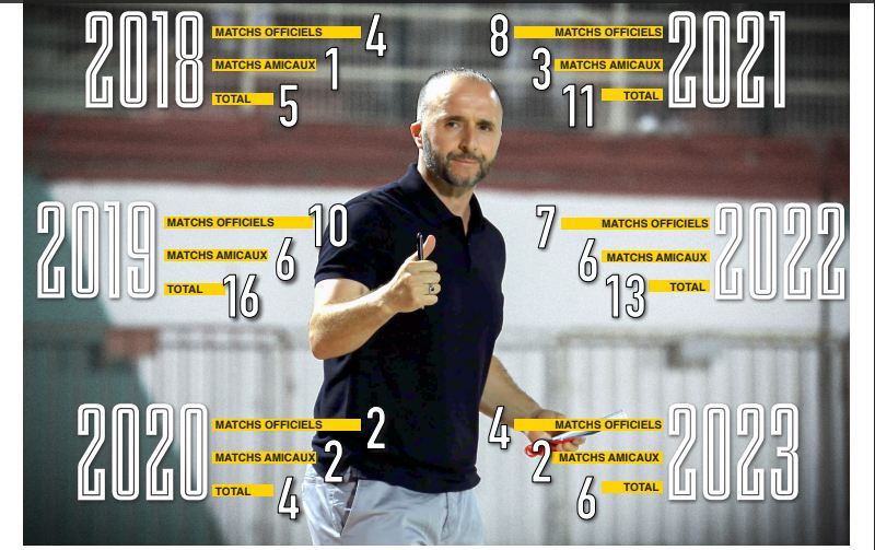 وقدمت الاتحادية أيضا أرقاما خاصة بكل سنة، بداية من 2018 وصولا إلى السنة الجارية 2023، ووصلت النسبة المئوية لبلماضي إلى 35% مباراة ودية و65% أخرى رسمية.