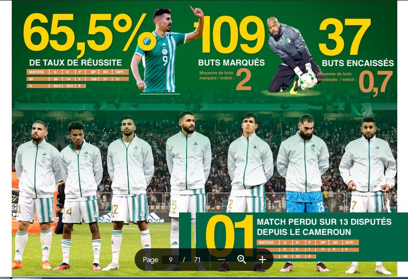 وحملت المجلة، جل المحطات التي مر بها المنتخب الوطني، تحت قيادة بلماضي، وأبرزها التتويج بلقب كأس أمم إفريقيا 2019 بالأراضي المصرية.