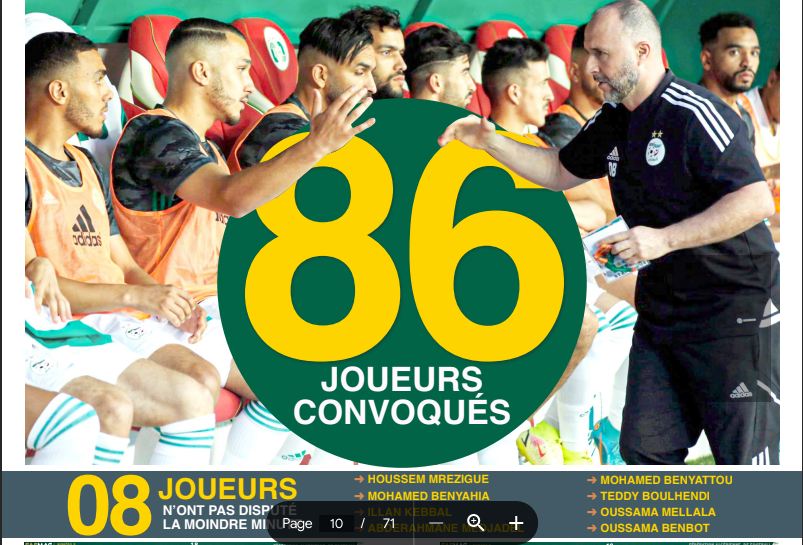 كما أوضحت مجلة الفاف، بأن بلماضي، استدعى للمنتخب منذ قدومه سنة 2018، 86 لاعبا 8 منهم فقط لم يلعبوا أي دقيقة.
