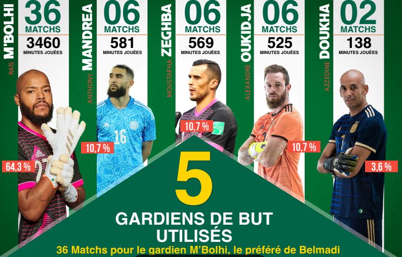 وتصدر مبولحي، قائمة أكثر الحراس مشاركة مع الخضر تحت قيادة بلماضي. بـ 36 مباراة جمع خلالها 3460 دقيقة. بينما حل دوخة في المركز الخامس والأخير بلقاءين جمع خلالهما 132 دقيقة.