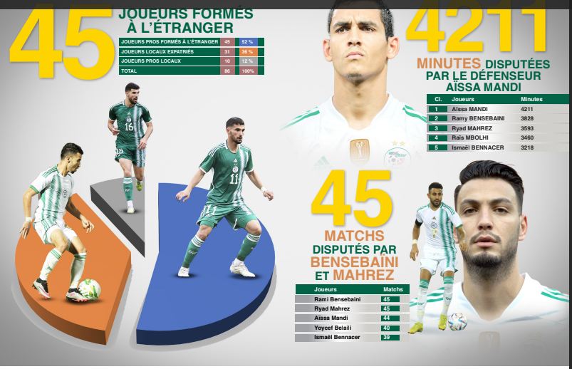 في حين تقاسم الثنائي رياض محرز ورامي بن سبعيني. قائمة أكثر اللاعبين مشاركة مع الخضر، برصيد 45 مباراة لكل منهما، يليهما ماندي، بينما حل يوسف بلايلي رابعا بـ 44 لقاء وإسماعيل بن ناصر بـ 39.