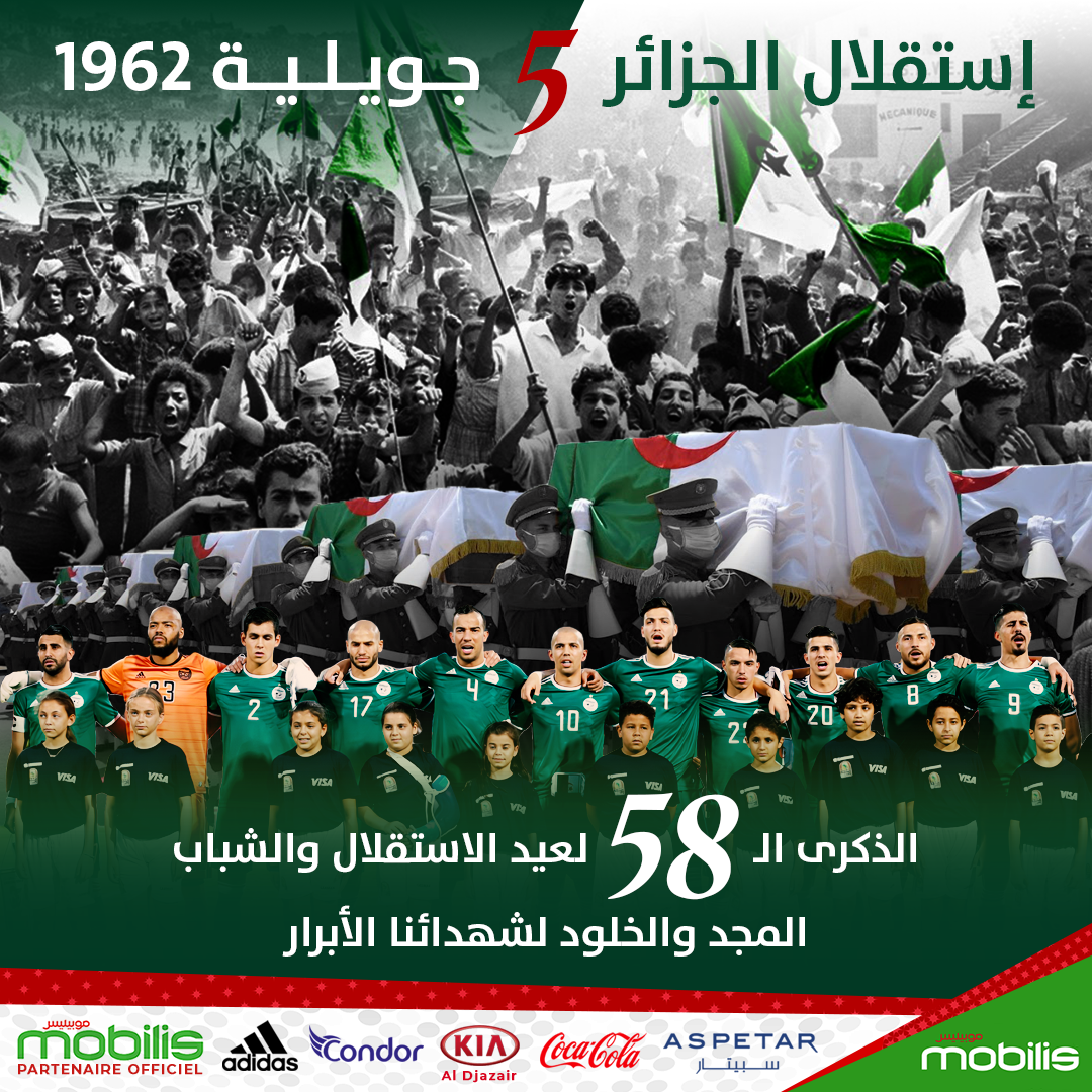 هنّأ الإتحاد الجزائري لكرة القدم الشعب الجزائري بمناسبة الذكرى 58 لعيد الإستقلال والشباب حسب ما ذكره موقع الفاف.