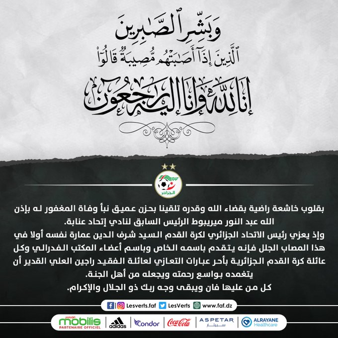 وقدم رئيس الفاف شرف الدين عمارة تعازيه لعائلة الفقيد باسمه وباسم كافة أعضاء المكتب الفيدرالي.