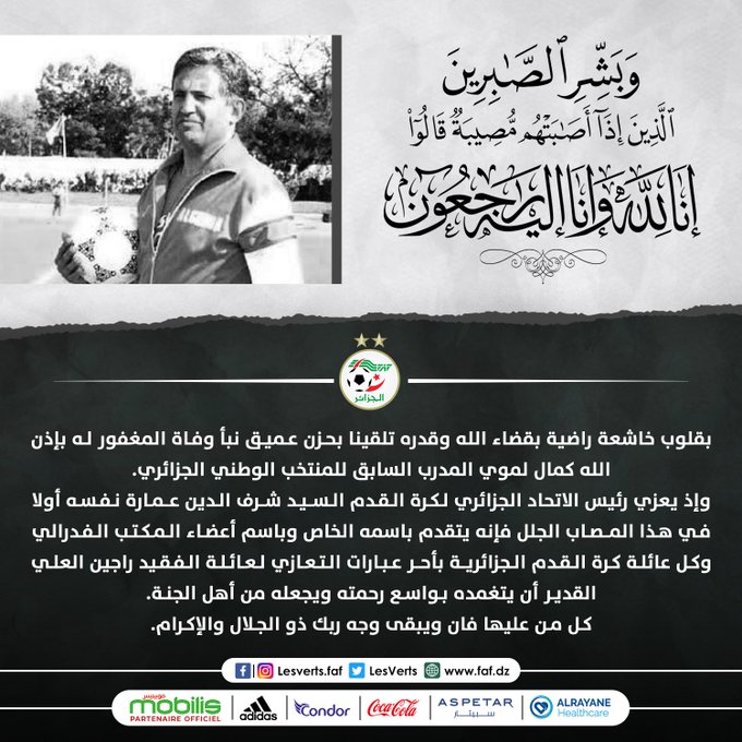 وقدم خلال ذات الرسالة رئيس الفاف شرف الدين عمارة تعازيه الخالصة لعائلة فقيد كرة القدم الجزائرية.