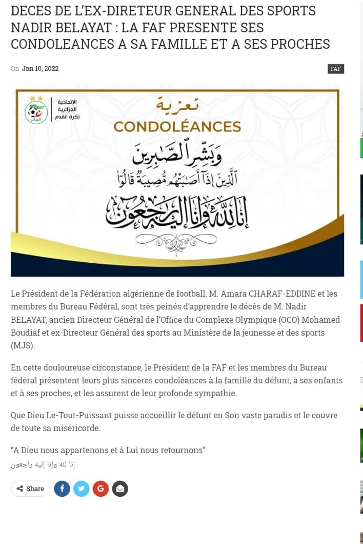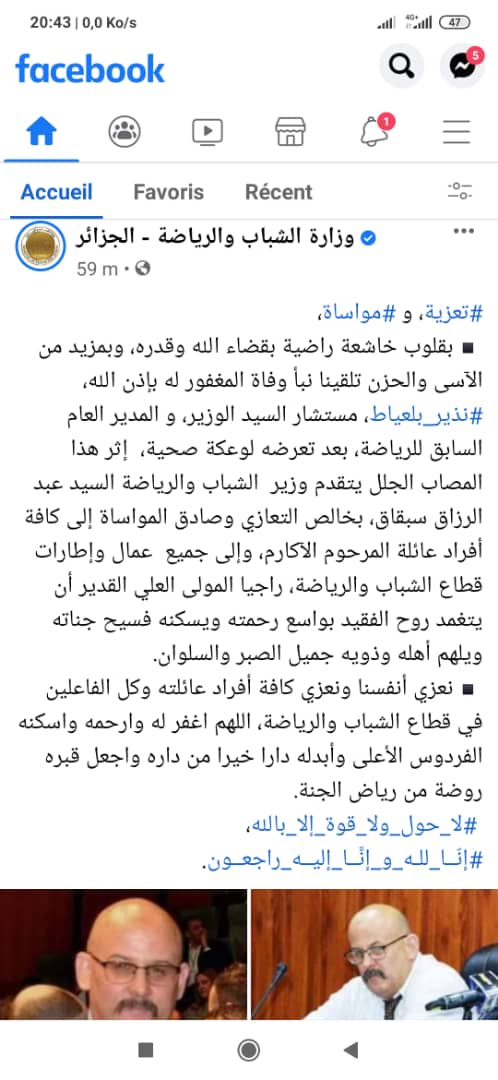 ونشر الحساب الرسمي لوزارة الشباب والرياضة، عبارات التعزية التي وجهها الوزير سبقاق، إثر هذا المصاب الجلل.