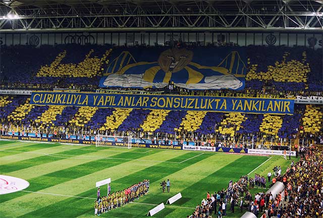 فيما يأتي “تيفو” فينرباتشي في داربي إسطنبول أمام بيشكتاس في المركز الأول، خلال اللقاء الذي انتهى بفوز فينرباتشي بنتيجة2-1.