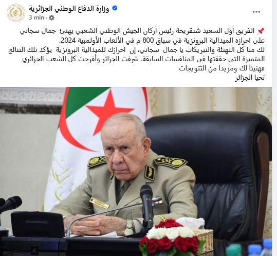 ونشرت وزارة الدفاع الوطني الجزائرية، عبر الصفحة الرسمية لها على “الفايسبوك”، تهنئة الفريق أول السعيد شنقريحة رئيس أركان الجيش الوطني، اليوم السبت، “الفريق أول السعيد شنقريحة رئيس أركان الجيش الوطني الشعبي يهنئ جمال سجاتي على احرازه الميدالية البرونزية في سباق 800 م في الألعاب الأولمبية 2024”.