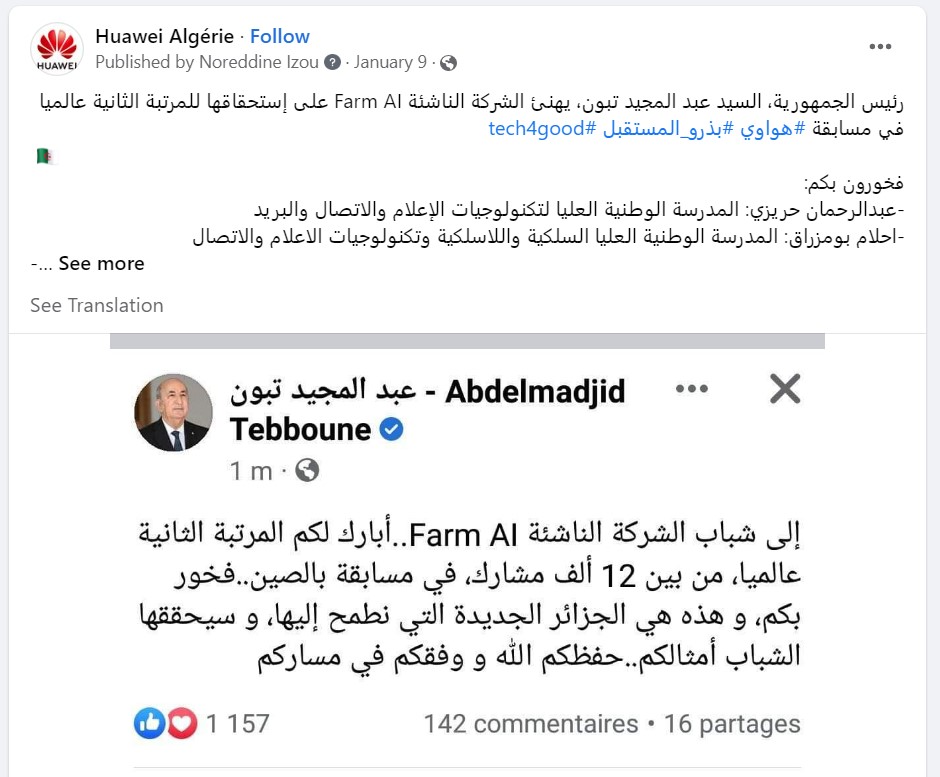 فللمرة الأولى فريق من القارة الإفريقية يتحصل على المترتبة الثانية في المسابقة العالمية وبذلك سيتواجد بالصين لمشاركة هذه التجربة المنظمة من طرف هواوي.