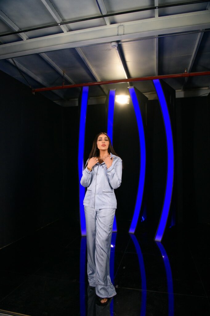 وتفاجأ جمهور الفنانة أحلام بلباسها “بيجاما” باللون الأزرق الفاتح منتعلة حذاء أسود بكعب عالي.