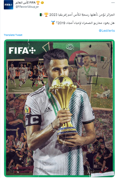 قدّمت الاتحادية الدولية لكرة القدم، الفيفا، رسالة دعم للقائد رياض محرز ورفقائه في المنتخب الوطني بعد حسم التأهل إلى الكان.
