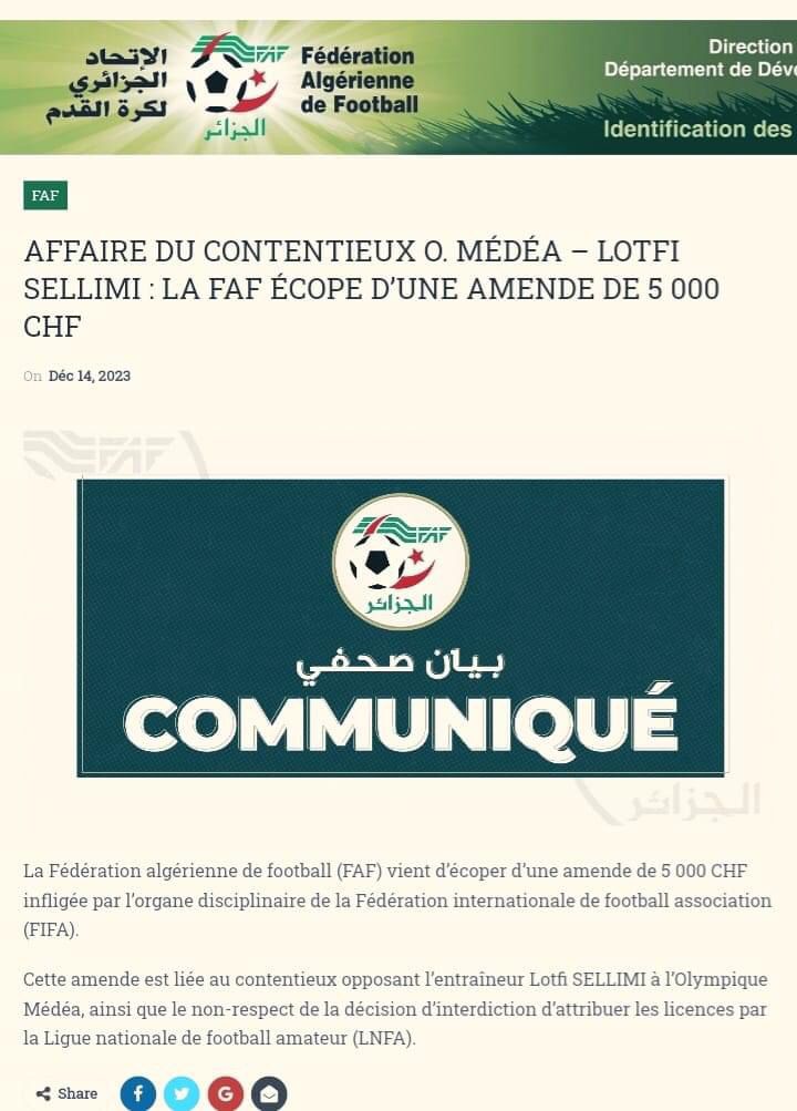 عاقب الإتحاد الدولي لكرة القدم، الفاف، بـ 50 ألف فرنك سويسري بسبب قضية أولمبي المدية و المدرب التونسي عادل السليمي.