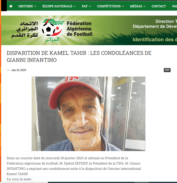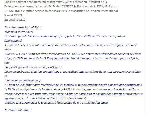 كشفت “الفاف” برئاسة جهيد زفيزف عن تلقيها برقية تعزية من قبل رئيس “الفيفا” جياني انفانتينو. في وفاة لاعب الخضر سابقا كمال طاهير.