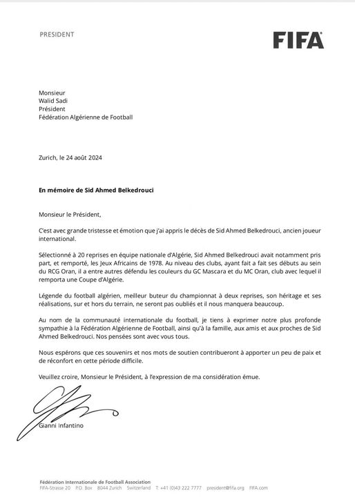 كما أضاف: “بالنيابة عن المجتمع الدولي لكرة القدم، أود أن أعرب عن تعاطفنا العميق مع الاتحاد الجزائري لكرة القدم. وكذلك مع عائلة سيد أحمد بلكدروسي وأصدقائه وأحبائه، أفكارنا معكم جميعا”.