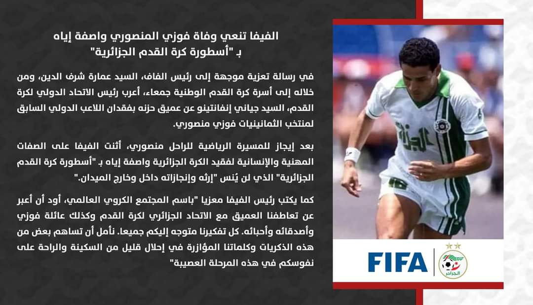 تلقى الاتحاد الجزائري لكرة القدم، رسالة تعزية من “الفيفا” في وفاة لاعب المنتخب الوطني السابق، فوزي منصوري.