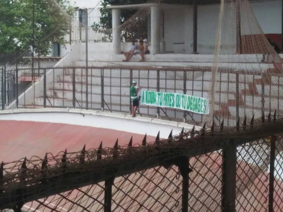 وقام أنصار رائد القبة بتعليق لافتة كبيرة على حافة مدرجات ملعب 20 أوت كتب عليها: “ادفع أو ارحل”، في رسالة مباشرة لرئيس فريقهم، ناصر فارس، الذي لم يسوّ لحد الساعة مستحقات لاعبيه التي وعدهم بها، وقد حاصروه هؤلاء الأنصار فارس عند نهاية اللقاء وطالبوه بالرحيل، غير أن هذا الأخير كان رده مباشرا بالقول إنه لا يستطيع فعل كل شيء بمفرده، ومن يستطيع خلافته فليتقدم.