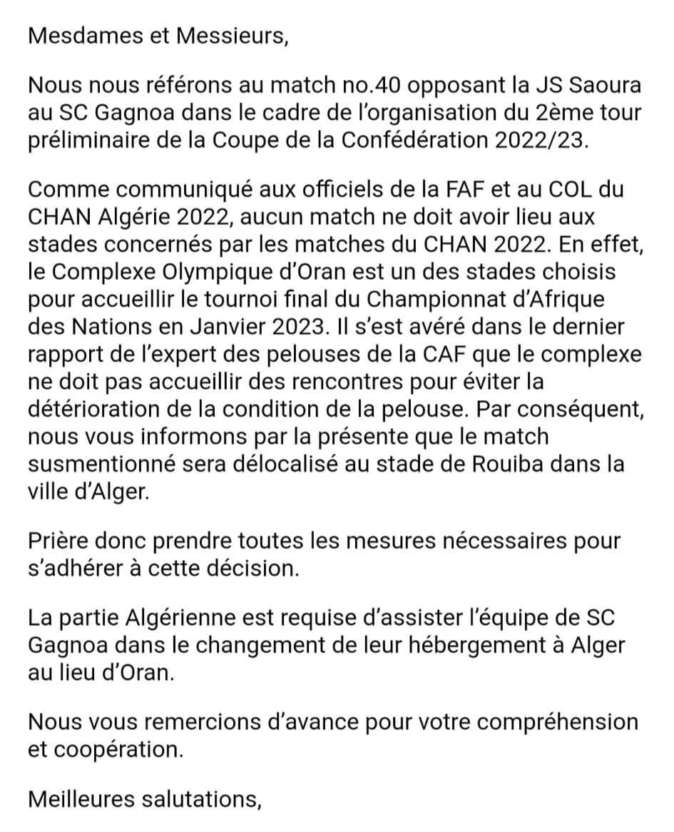 كما أضافت “الكاف” أن الساورة مُطالبة بالاستقبال بملعب الرويبة أو ملعب 08 ماي 1945 بسطيف.