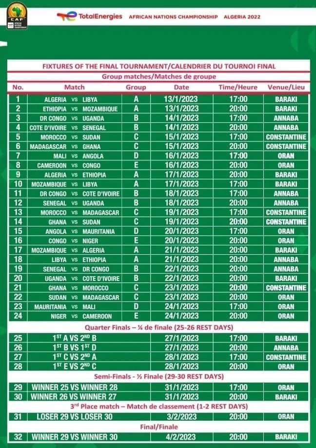ومن المرتقب أنّ تنطلق منافسة الشان بداية من تاريخ 13 جانفي لغاية 4 فيفري 2023، وسيلعب المنتخب الوطني المحلي مباريات المجموعة الأولى بملعب براقي.