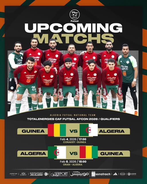 أعلن الاتحاد الجزائري لكرة القدم عن برنامج مباراتي المنتخب الوطني لكرة القدم داخل القاعة أمام منتخب غينيا، ضمن الدور التصفوي الأخير المؤهل لنهائيات كأس أمم إفريقيا للفوتصال 2026.