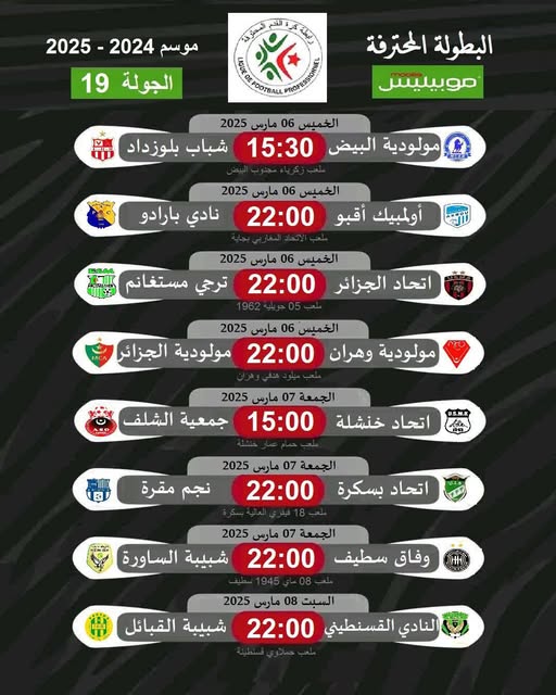 كشفت لجنة تنظيم مباريات الرابطة المحترفة الأولى لكرة القدم، اليوم الأحد، عن برنامج و مباريات الجولة 19.