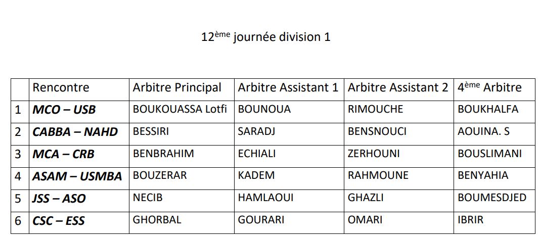 كشفت اللجنة الفيدرالية للتحكيم التابعة للإتحاد الجزائري لكرة القدم عن أسماء الحكام المعنيين بإدارة مباريات الجولة 12 من الرابطة الوطنية المحترفة الأولى.