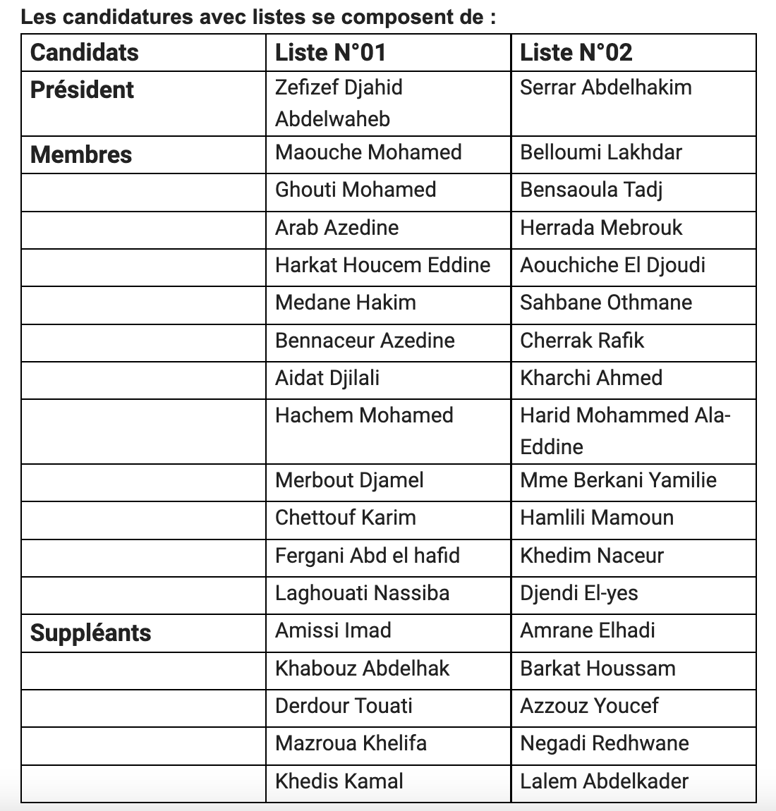ونشر الموقع الرسمي للفاف، القائمة الكاملة الخاصة بالمتنافسين على رئاسة الفاف، جهيد زفزاف، وعبد الحكيم سرار، والتي ضمت الأسماء التالية: