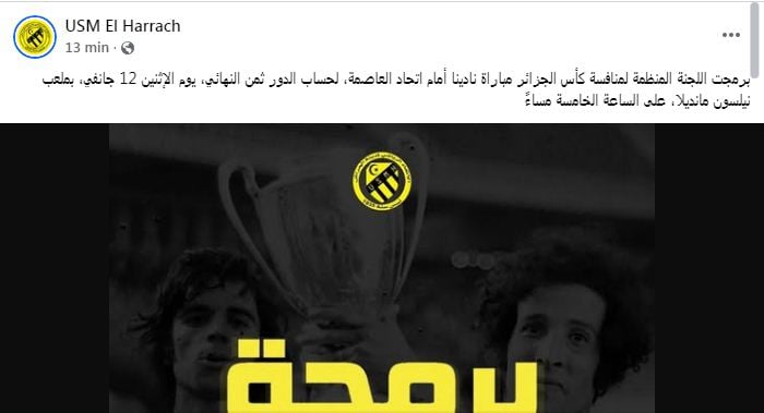 وفي المقابل، برمجت لجنة تنظيم منافسة كأس الجزائر. قمة اتحاد الحراش واتحاد العاصمة، حسب بيان نشرته الصفحة الرسمية لـ”الصفرا” بملعب “نيلسون مانديلا” ببراقي، بداية من الساعة 17:00.