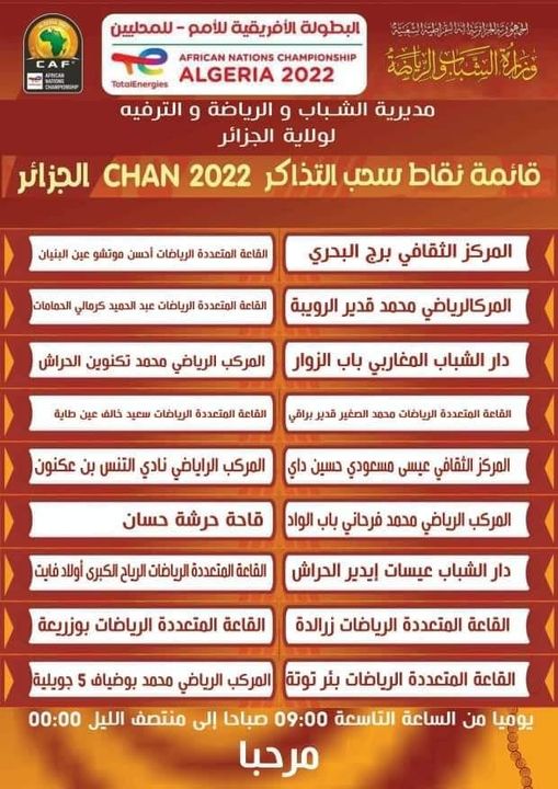 كشفت مديرية الشاب والرياضية والترفيه لولاية الجزائر عن قائمة لنقاط سحب تذاكر مباريات كأس إفريقيا للمحليين بالجزائر.